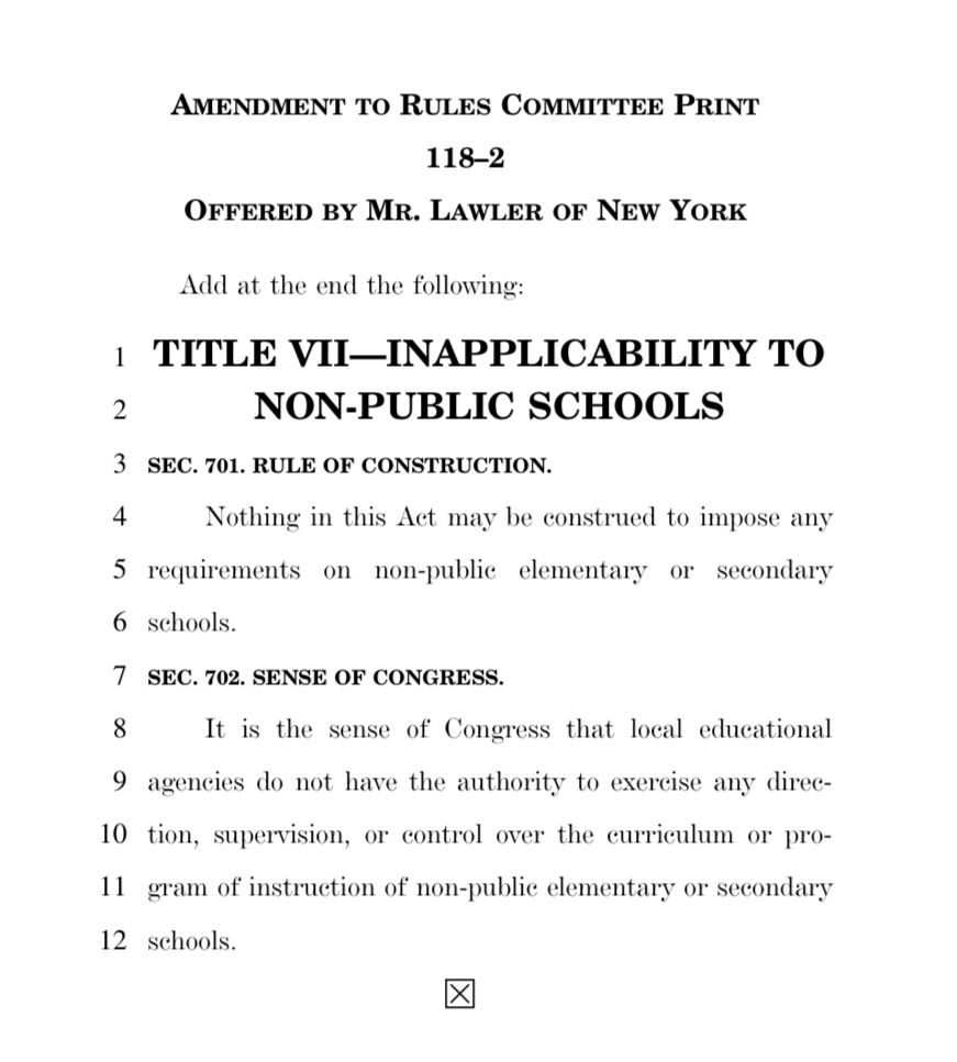 An amendment to the Parents Bill of Rights being advanced by Republicans in the House of Representatives was proposed by Congressman Mike Lawler, whose district covers Rockland County, in order to make it clear that non-public elementary and secondary schools would not be subject to any requirements under the bill.