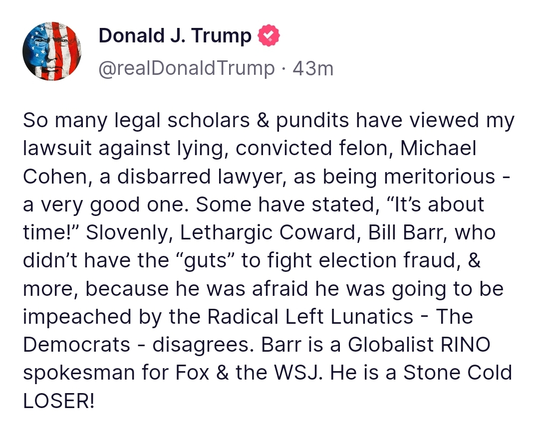 “Slovenly, Lethargic Coward, Bill Barr, who didn’t have the “guts” to fight election fraud, & more, because he was afraid he was going to be impeached by the Radical Left Lunatics – The Democrats – disagrees. Barr is a Globalist RINO spokesman for Fox & the WSJ. He is a Stone Cold LOSER!”