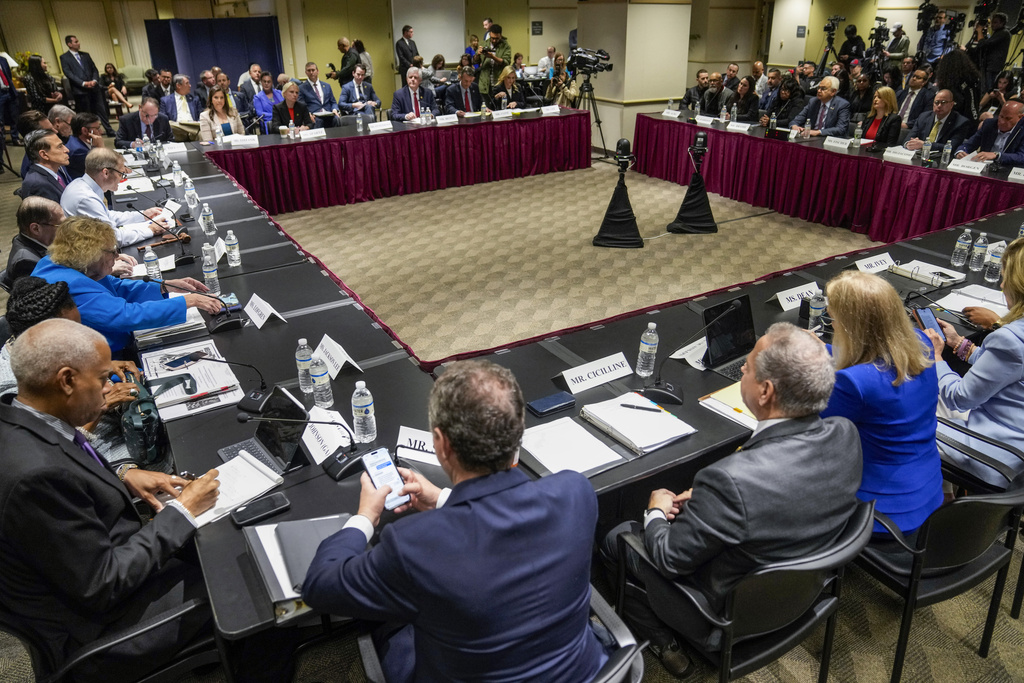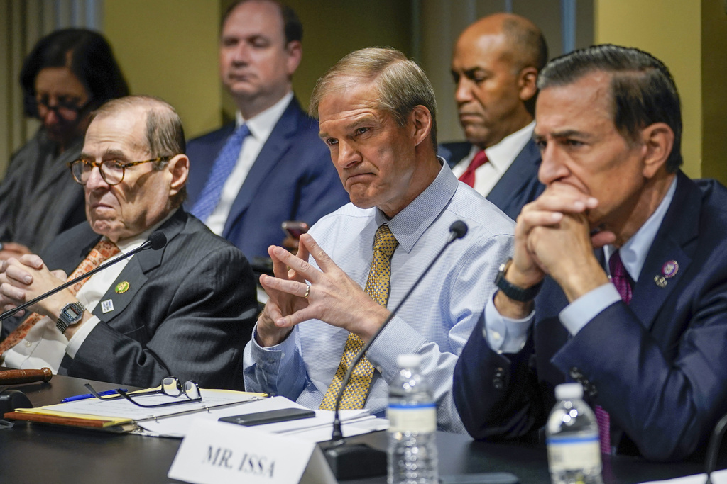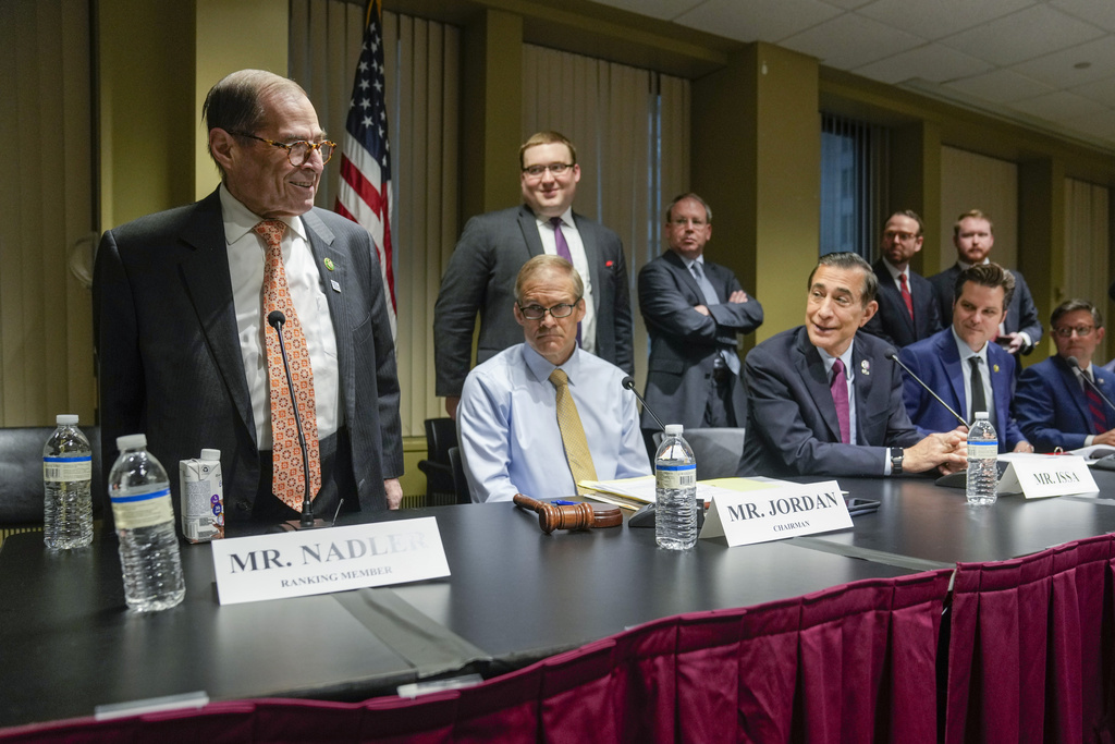 House Judiciary Committee Chair Jim Jordan, R-Ohio, takes his seat before a House Judiciary Committee Field Hearing, Monday, April 17, 2023, in New York. Republicans upset with Donald Trump’s indictment are escalating their war on the prosecutor who charged him, trying to embarrass him on his home turf. The committee is holding a field hearing near the offices of Manhattan District Attorney Alvin Bragg. (AP Photo/John Minchillo)Rep. Jerry Nadler, D-N.Y., left, takes his seat alongside House Judiciary Committee Chair Jim Jordan, R-Ohio, center, before a House Judiciary Committee Field Hearing, Monday, April 17, 2023, in New York. Republicans upset with Donald Trump’s indictment are escalating their war on the prosecutor who charged him, trying to embarrass him on his home turf. (AP Photo/John Minchillo)House Judiciary Committee Chair Jim Jordan, R-Ohio, gavels in a House Judiciary Committee Field Hearing, Monday, April 17, 2023, in New York. Republicans upset with Donald Trump’s indictment are escalating their war on the prosecutor who charged him, trying to embarrass him on his home turf. (AP Photo/John Minchillo)House Judiciary Committee Chair Jim Jordan, R-Ohio, convenes a House Judiciary Committee Field Hearing, Monday, April 17, 2023, in New York. Republicans upset with former President Donald Trump’s indictment are escalating their war on Manhattan District Attorney Alvin Bragg who charged him, trying to embarrass him on his home turf. (AP Photo/John Minchillo)House Judiciary Committee Chair Jim Jordan, R-Ohio, center, Rep. Darrell Issa, R-Calif., right, and Rep. Jerry Nadler, D-N.Y., left, listen to witnesses during a House Judiciary Committee Field Hearing, Monday, April 17, 2023, in New York. Republicans upset with former President Donald Trump’s indictment are escalating their war on Manhattan District Attorney Alvin Bragg who charged him, trying to embarrass him on his home turf. (AP Photo/John Minchillo)