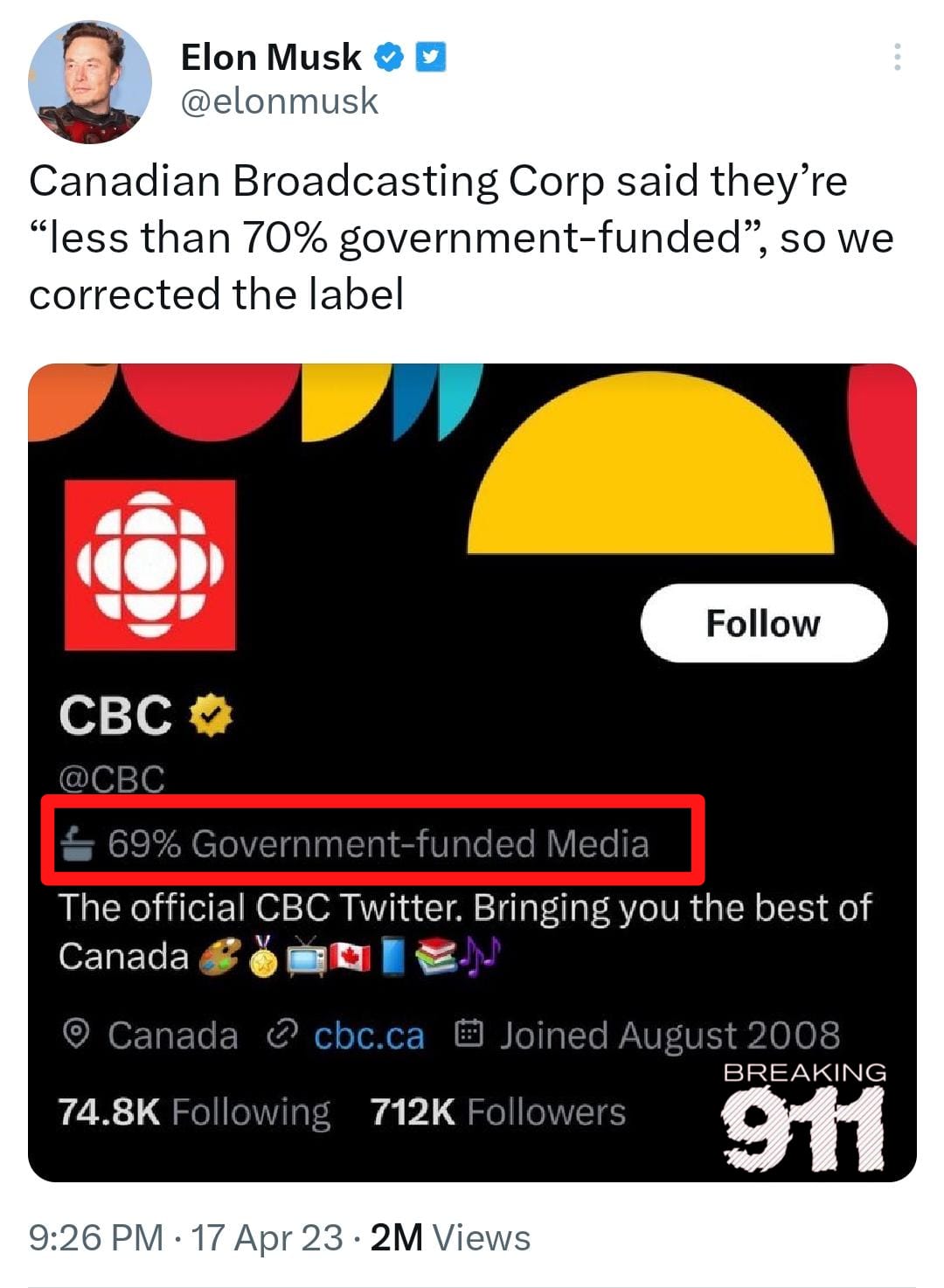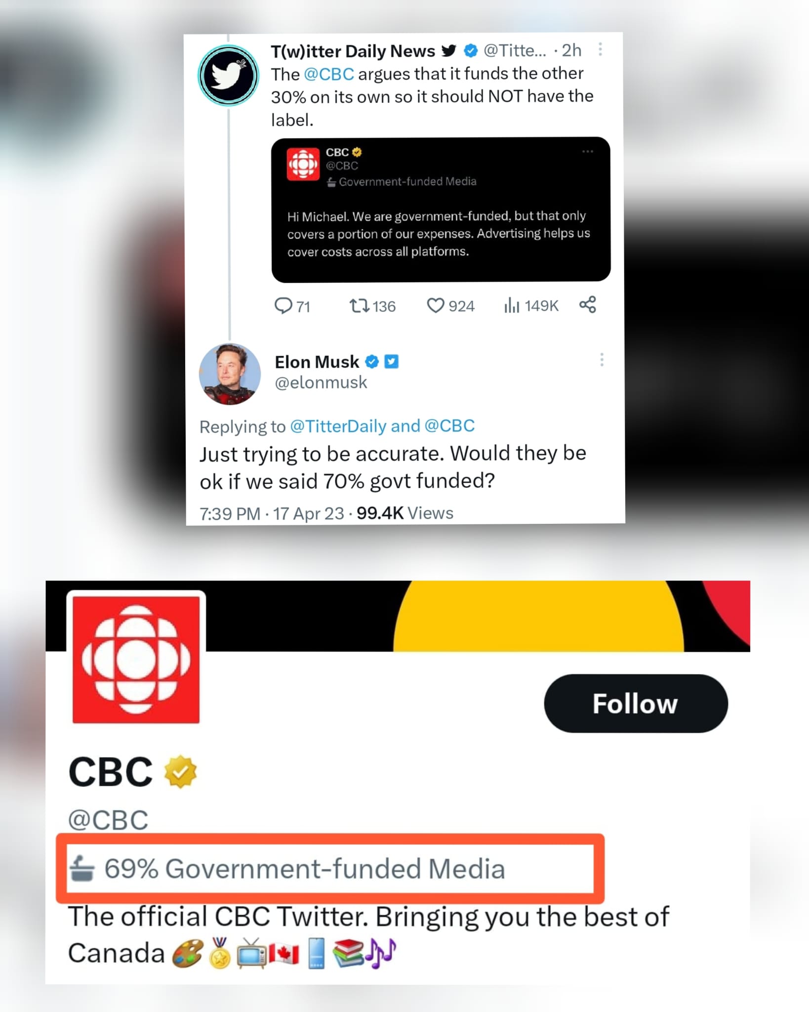 CBC has sent a letter to Twitter asking the company to re-examine the designation. Musk later tweeted about it and changed it to “69 percent Government-funded media.”