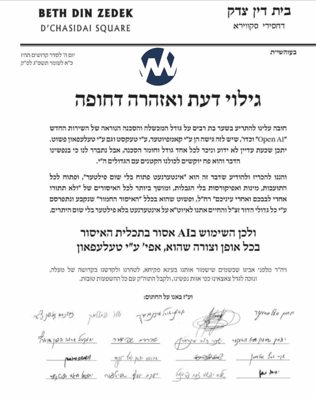 In what is believed to be a first-of-its-kind ban, more than a dozen rabbanim and dayanim from the Skver chasidus have signed a strongly worded letter assuring the use of AI chatbots.