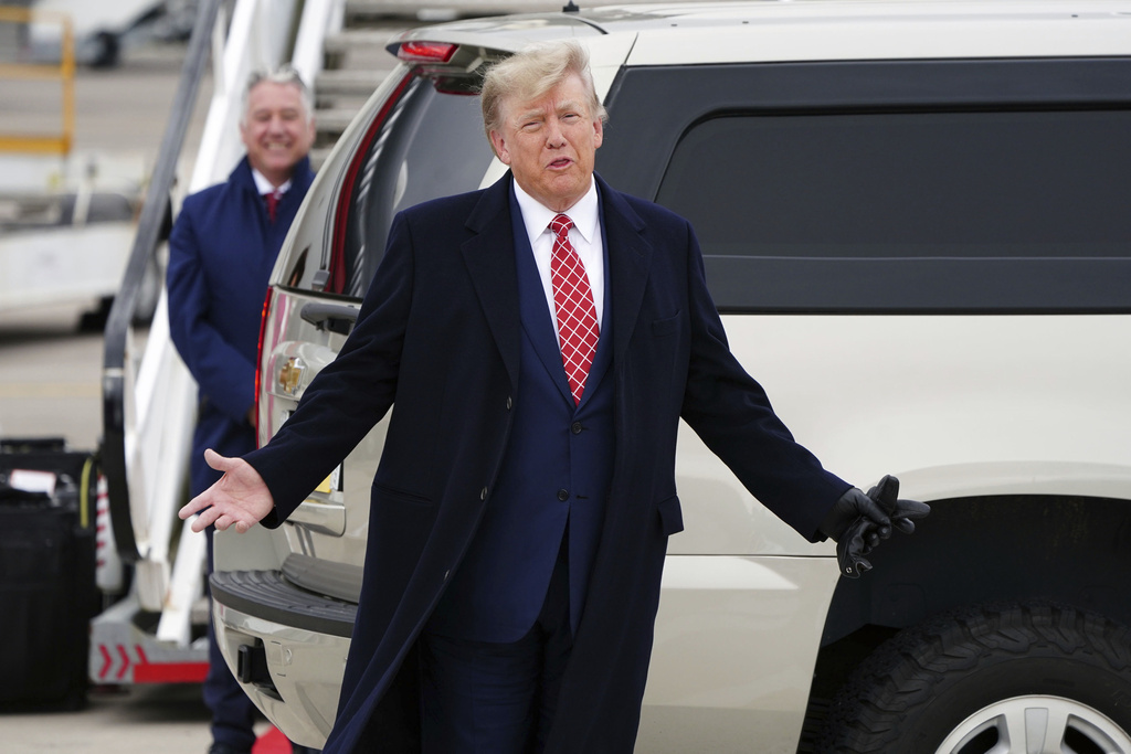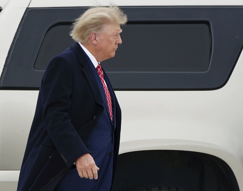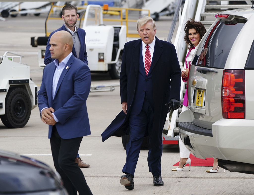 Former US president Donald Trump arrives at Aberdeen International Airport ahead of his visit to the Trump International Golf Links Aberdeen, in Dyce, Aberdeen, Scotland, Monday May 1, 2023. (Jane Barlow/PA via AP)