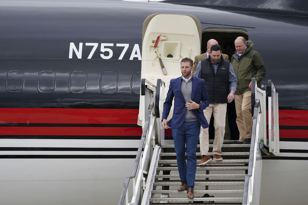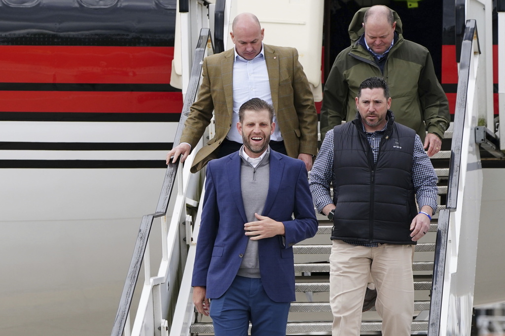 Eric Trump arriving arrives at Aberdeen International Airport, in Dyce, Aberdeen, with his father former US president Donald Trump (not in picture) ahead of his visit to the Trump International Golf Links Aberdeen, in Dyce, Aberdeen, Scotland, Monday May 1, 2023. (Jane Barlow/PA via AP)