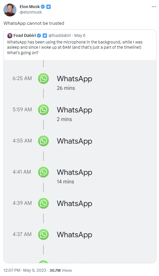 Musk’s message comes after Twitter user Foad Dabiri – Twitter’s director of engineering – showed evidence that WhatsApp had been using his phone’s microphone in the background without telling him.