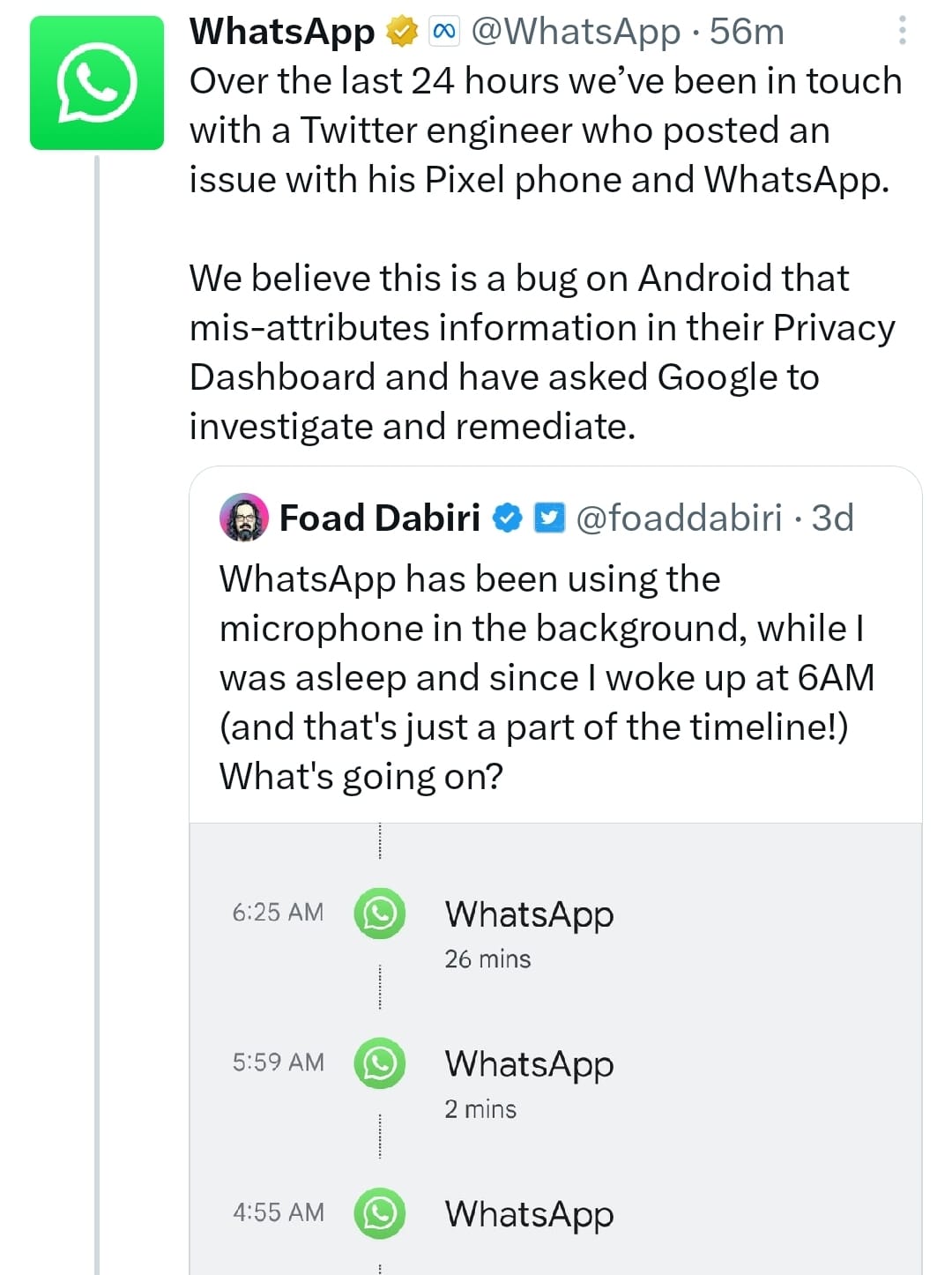 In response to Dabiri and Musk, WhatsApp released a statement on Twitter: “Over the last 24 hours we’ve been in touch with a Twitter engineer who posted an issue with his Pixel phone and WhatsApp. We believe this is a bug on Android that mis-attributes information in their Privacy Dashboard and have asked Google to investigate and remediate. Once granted permission, WhatsApp only accesses the mic when a user is making a call or recording a voice note or video – and even then, these communications are protected by end-to-end encryption so WhatsApp cannot hear them.”
