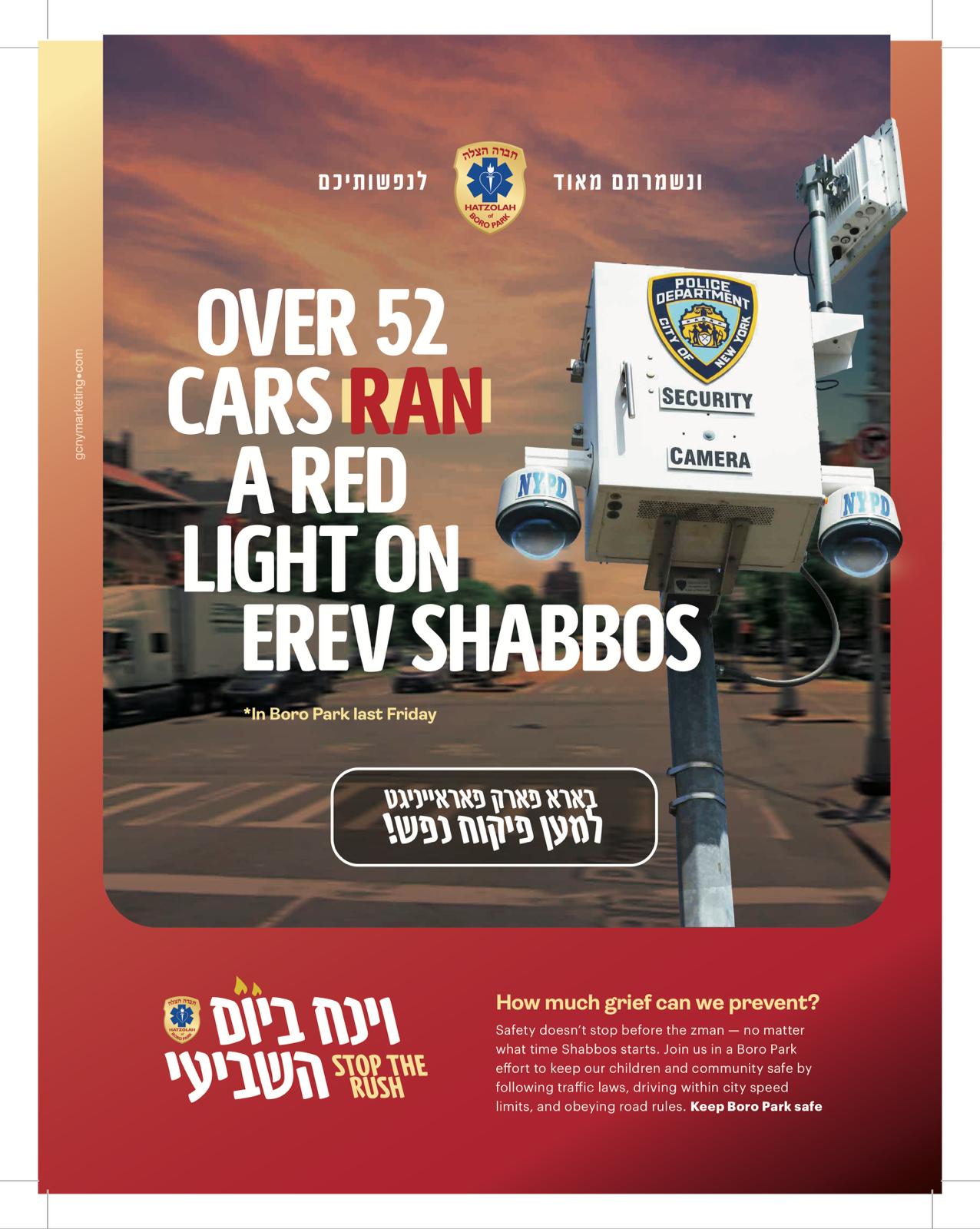 A flyer released by Hatzolah stated that 52 drivers blew through red lights this past Friday alone, adding, “How much grief can we prevent?”