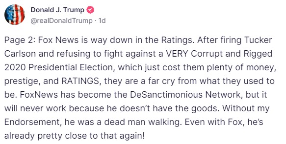“Page 2: Fox News is way down in the Ratings. After firing Tucker Carlson and refusing to fight against a VERY Corrupt and Rigged 2020 Presidential Election, which just cost them plenty of money, prestige, and RATINGS, they are a far cry from what they used to be. FoxNews has become the DeSanctimonious Network, but it will never work because he doesn’t have the goods. Without my Endorsement, he was a dead man walking. Even with Fox, he’s already pretty close to that again!” Trump raged.