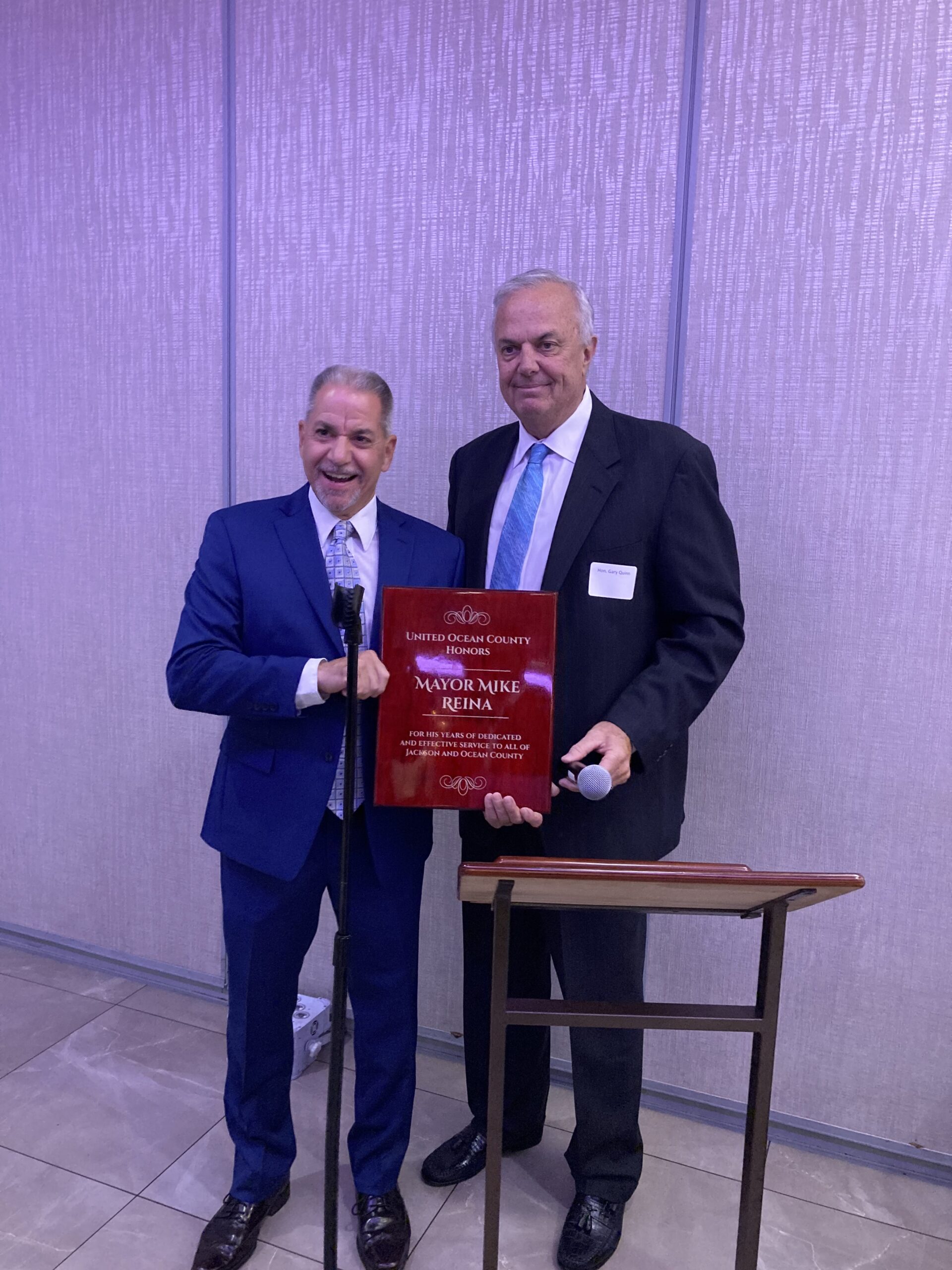 Following a ceremony at which Mike Reina was given a plaque “for his years of dedicated and effective service to all of Jackson and Ocean County,” the Jackson mayor addressed the crowd, saying that the honor was not about him, but about everyone in the room who were so diligently working to advance unity.