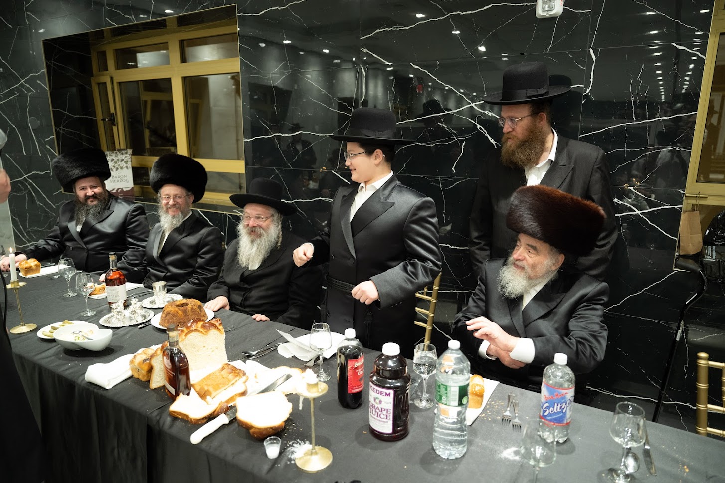 It was a special sight to see the ziknei Anash, the older Chassidim who had merited to be by the Beis Yisroel of Ger, the Lev Simcha, and the Pnei Menachem, and continue to be tethered with heart and soul to the current Rebbe, shlit”a, sitting in the front row, drawing nachas from the proceedings, and observing the younger generations, fathers and young children passing by to give shulem to the Rebbe’s son, and rejoicing together in the joy of Rashbi. During his address, he noted the remarkable growth of the kehillah, and how his illustrious father continues to notice the chashuve yungeleit that he has in America.