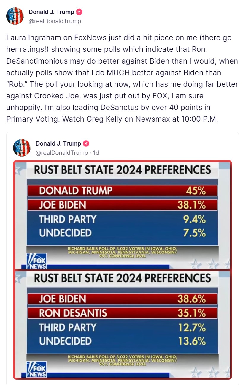 “Laura Ingraham on FoxNews just did a hit piece on me (there go her ratings!) showing some polls which indicate that Ron DeSanctimonious may do better against Biden than I would, when actually polls show that I do MUCH better against Biden than ‘Rob,’” Trump wrote.