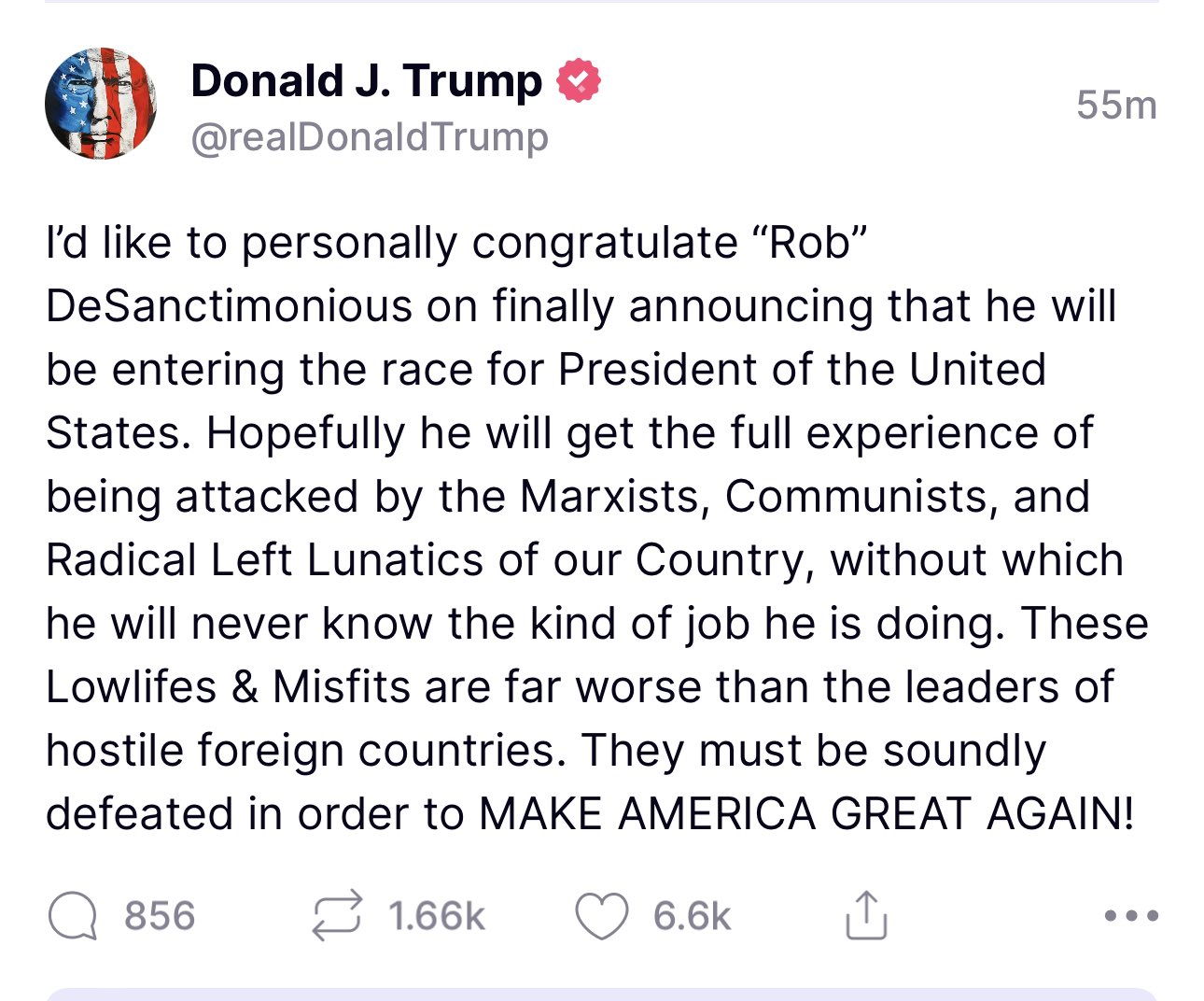 I’d like to personally congratulate “Rob” DeSanctimonious on finally announcing that he will be entering the race for President of the United States. Hopefully he will get the full experience of being attacked by the Marxists, Communists, and Radical Left Lunatics of our Country, without which he will never know the kind of job he is doing. These Lowlifes & Misfits are far worse than the leaders of hostile foreign countries. They must be soundly defeated in order to MAKE AMERICA GREAT AGAIN!