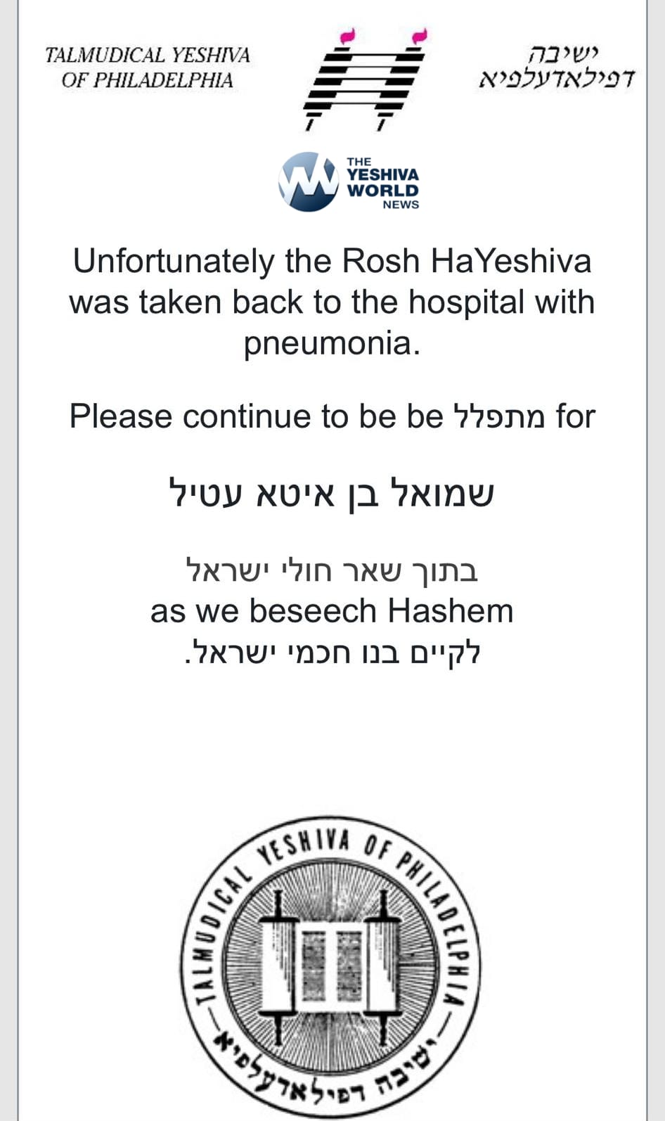 Unfortunately, the Rosh Yeshiva was hospitalized once again, this time with pneumonia.