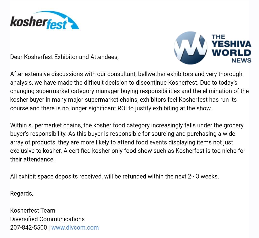 “Within supermarket chains, the kosher food category increasingly falls under the grocery buyer’s responsibility. As this buyer is responsible for sourcing and purchasing a wide array of products, they are more likely to attend food events displaying items not just exclusive to kosher. A certified kosher only food show such as Kosherfest is too niche for their attendance,” it added.