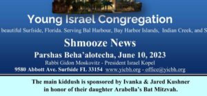 The Kushners sponsored the kiddush at the Young Israel shul in Surfside this past Shabbos in honor of Arabella’s bas mitzvah.