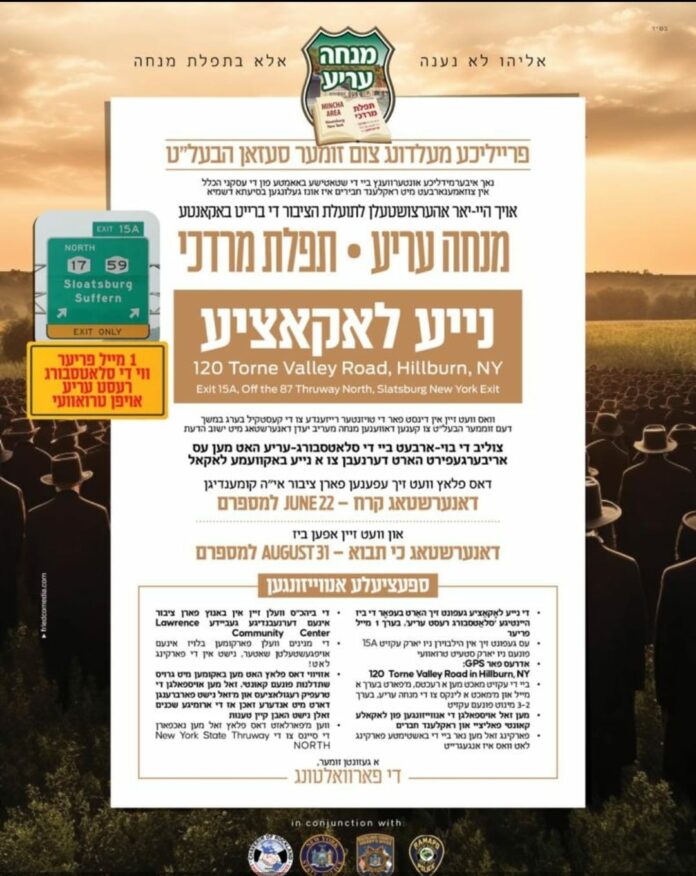 Under an agreement reached with the Town of Ramapo, the Mincha Area will open for the season on June 22nd at 120 Torne Valley Road in Hillburn, NY., just minutes from the Thruway’s Exit 15 A. The location will offer convenient and safe parking for thousands of travelers and is located alongside the Joseph T. St. Lawrence Community Center. Chaverim of Rockland will be on hand every Thursday night over the nine week summer season to manage parking and ensure the area’s security and upkeep so that everything proceeds smoothly, both for travelers and those living nearby.