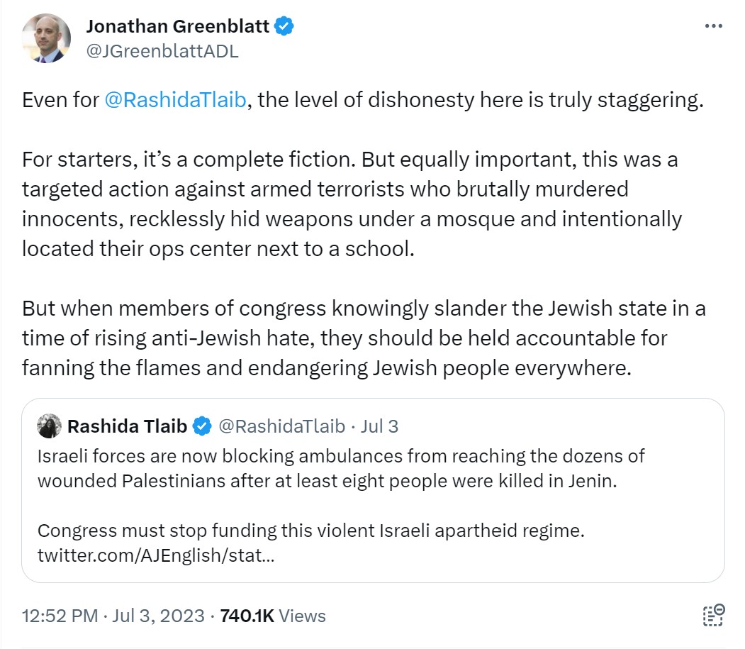 Greenblatt’s criticism came in response to a tweet shared by Tlaib, wherein she claimed that Israeli forces were obstructing ambulances from reaching wounded Palestinians following a reported death toll of at least eight people in Jenin. Tlaib went on to call for an end to funding the alleged “violent Israeli apartheid regime.” Greenblatt promptly replied to her tweet, stating, “Even for @RashidaTlaib, the level of dishonesty here is truly staggering.”