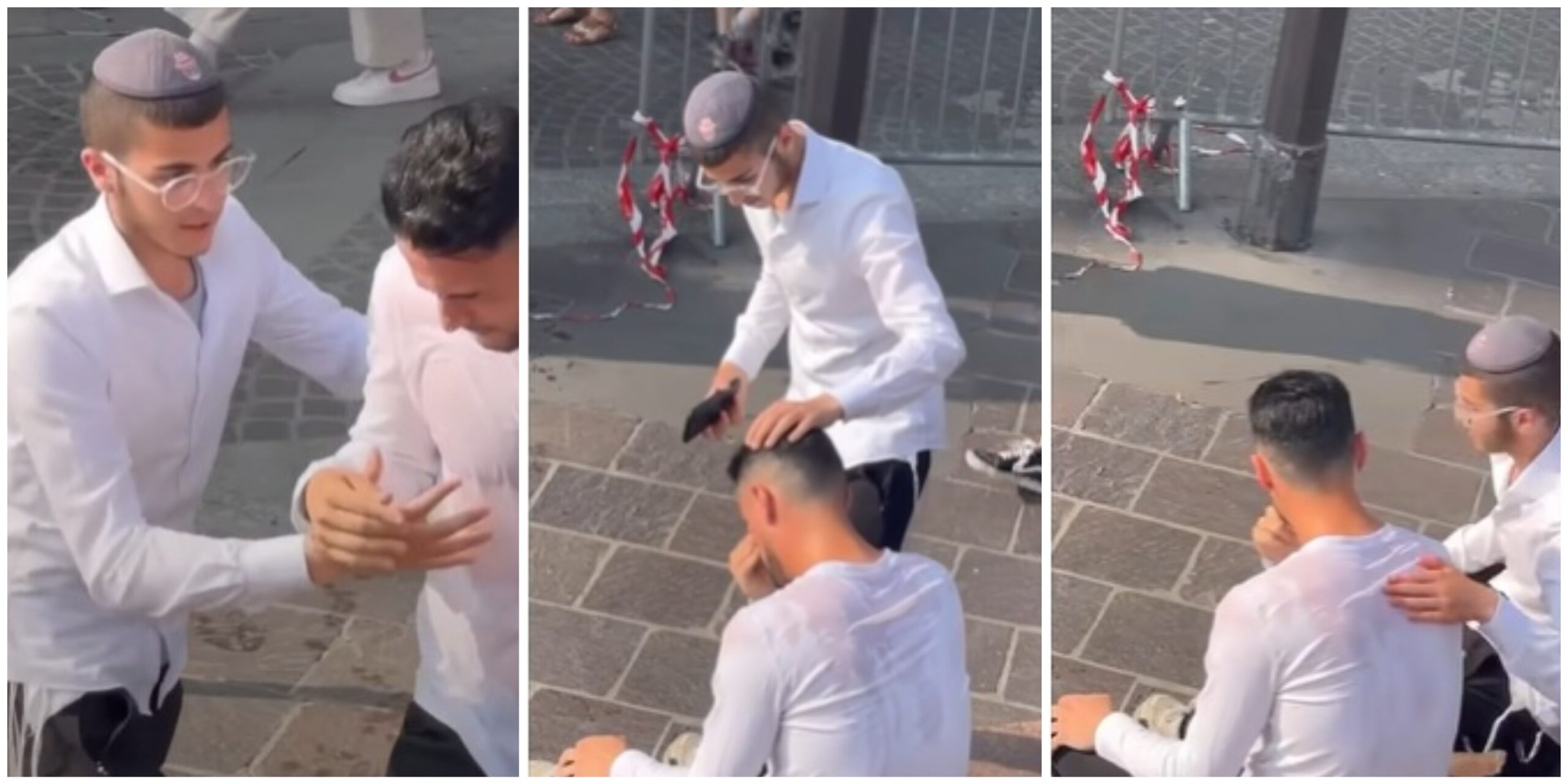 No one did anything to try to stop him except a frum man wearing a yarmulke and tzitzis, who rushed to knock his lighter to the floor and pull him away to a less crowded area to calm him down and comfort him.