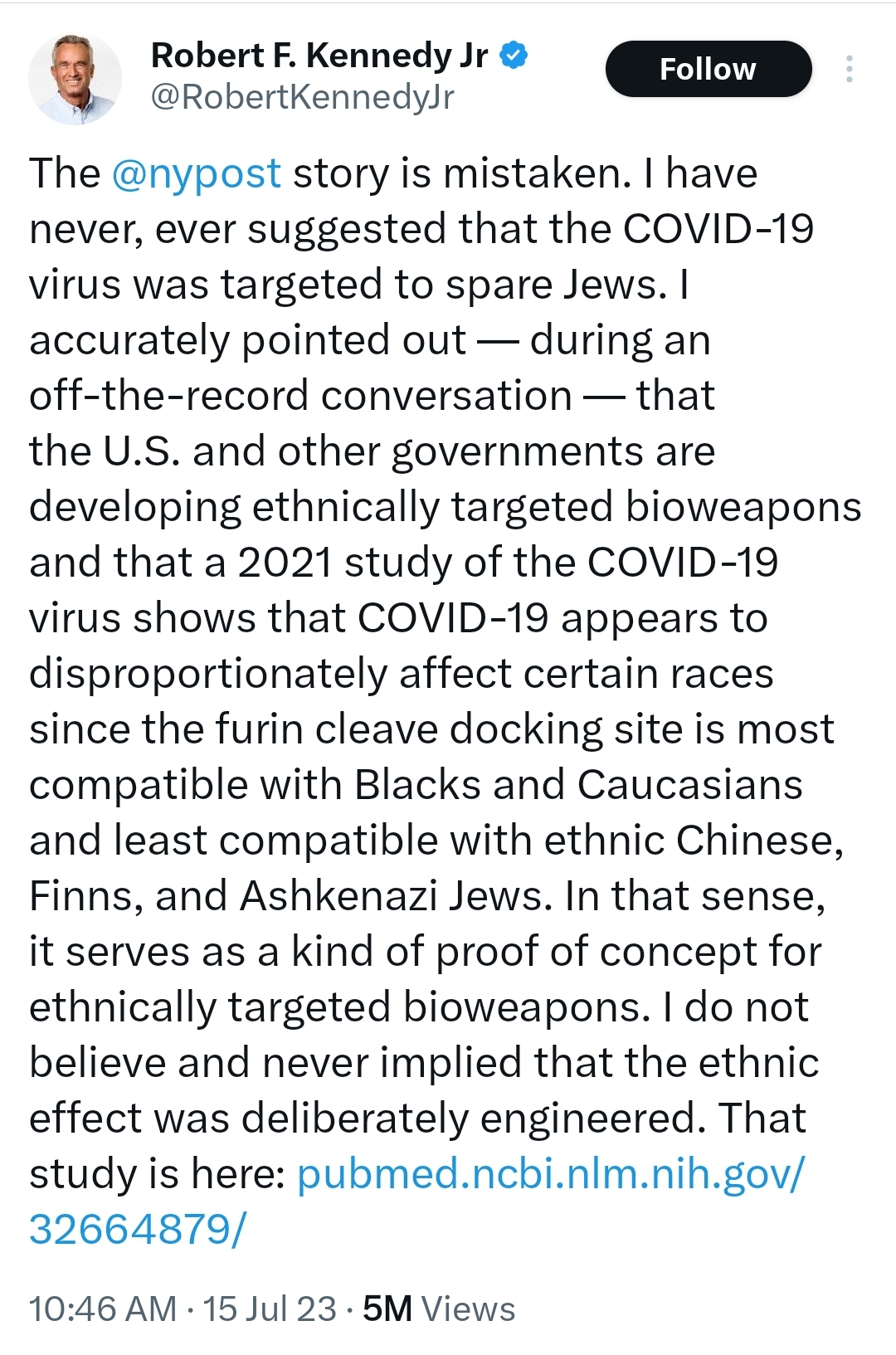 There is nothing wrong with what he said. There was a time when saying the virus was made in a lab was a conspiracy theory, until they admitted it. I’ve got news for you, a virus made in a lab is a bio-weapon. So he’s just adding that bio-weapons can be specific for certain ethinicities. Is that so hard to accept?