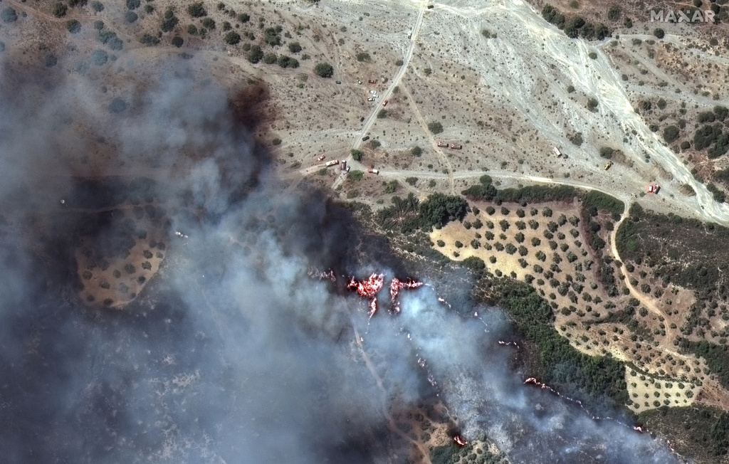 Greece is using an EU satellite service to estimate the damage caused by the fire and to target resources. Photographs published online by the service showed a brown hourglass-shaped burn scar across the middle of the island.