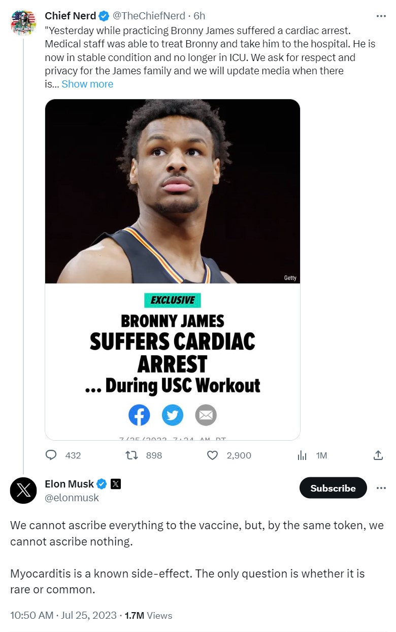 As he does with practically every high-profile incident, Elon Musk inserted himself into the discussion, this time by floating the possibility that the COVID vaccine may have played a role in the young athlete’s health crisis. Musk, the CEO of Tesla and the owner of Twitter (which he rebranded as “X” after a $44 billion purchase last year), tweeted his thoughts on the matter on Tuesday. He acknowledged that attributing everything to the vaccine might not be accurate, but likewise, dismissing any potential connection entirely might not be justified either.