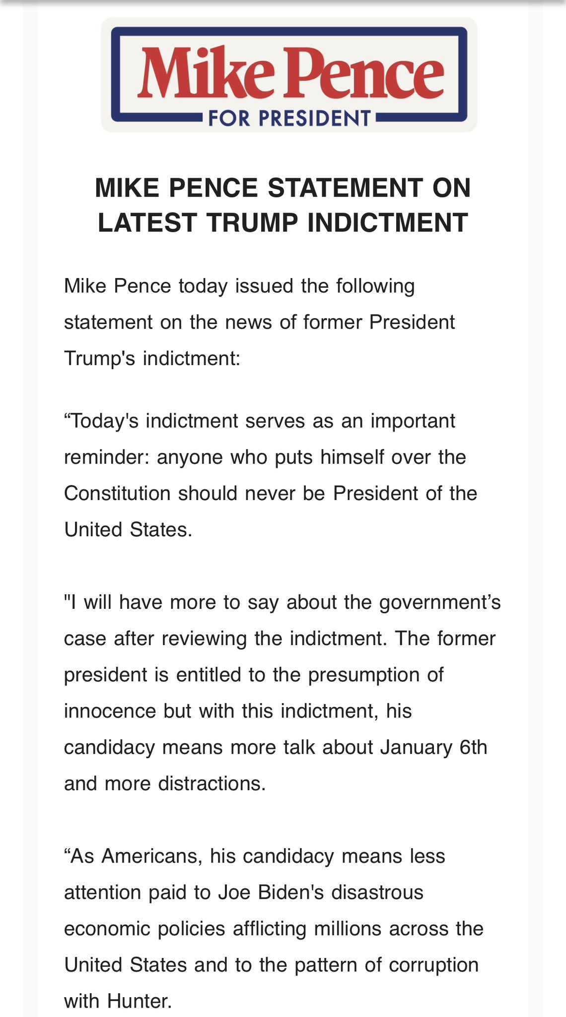 Former VP Mike Pence, a key witness in the indictment, said the “indictment serves as an important reminder: Anyone who puts himself over the Constitution should never be president of the United States.”