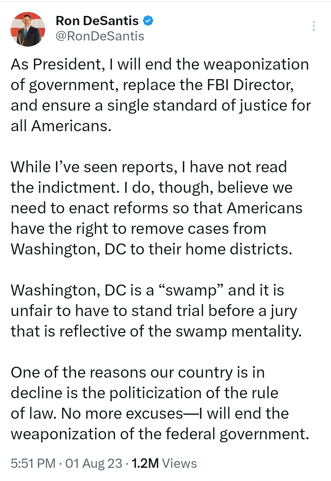 Second-place presidential candidate Ron DeSantis reacted by saying he had not read the indictment, but vowed to “end the weaponization of government, replace the FBI director, and ensure a single standard of justice for all Americans” if elected president.