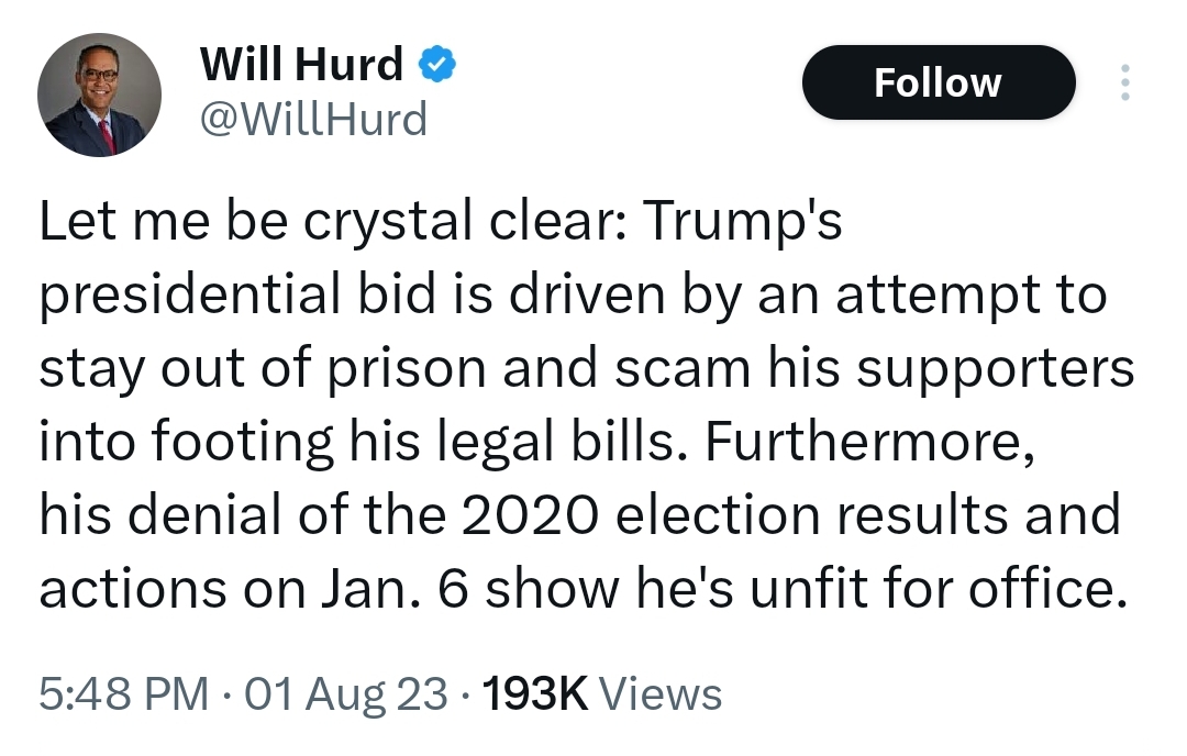 Former Rep. Will Hurd, another presidential candidate, said Trump’s campaign is “driven by an attempt to stay out of prison and scam his supporters into footing his legal bills.”