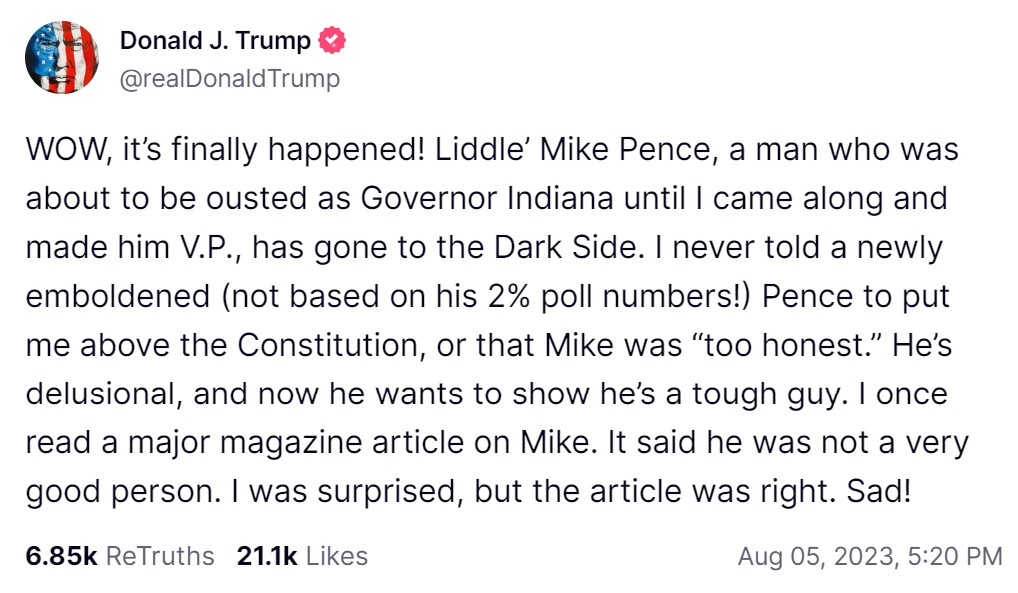 We all knew it was coming, and finally it happened. Former President Donald Trump took to Truth Social on Saturday to lash out at his Republican primary rival and former Vice President Mike Pence for his recent comments concerning Trump’s indictment over the events of January 6th.