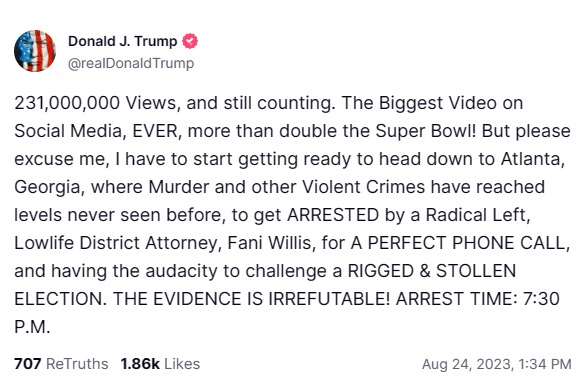 As seen in the post, Trump then shifted focus to his upcoming plans, saying he would be heading to Atlanta, Georgia, to get arrested by “a radical left , lowlife district attorney, Fani Willis” for a “perfect phone call” and for questioning the results of the “rigged and stollen” [sic] 2020 election, noting that he would turn himself in at 7:30 pm.