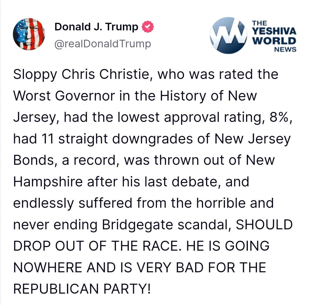 Trump lambasted Christie, writing, “Sloppy Chris Christie, who was rated the Worst Governor in the History of New Jersey, had the lowest approval rating, 8%, had 11 straight downgrades of New Jersey Bonds, a record, was thrown out of New Hampshire after his last debate, and endlessly suffered from the horrible and never-ending Bridgegate scandal, SHOULD DROP OUT OF THE RACE. HE IS GOING NOWHERE AND IS VERY BAD FOR THE REPUBLICAN PARTY!”