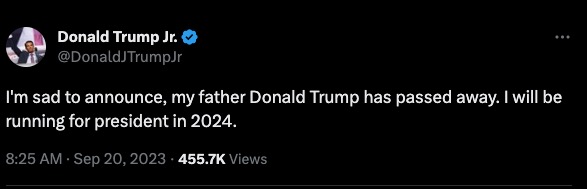 The fabricated message, which declared the passing of the former president, read, “I’m sad to announce, my father Donald Trump has passed away. I will be running for president in 2024.”