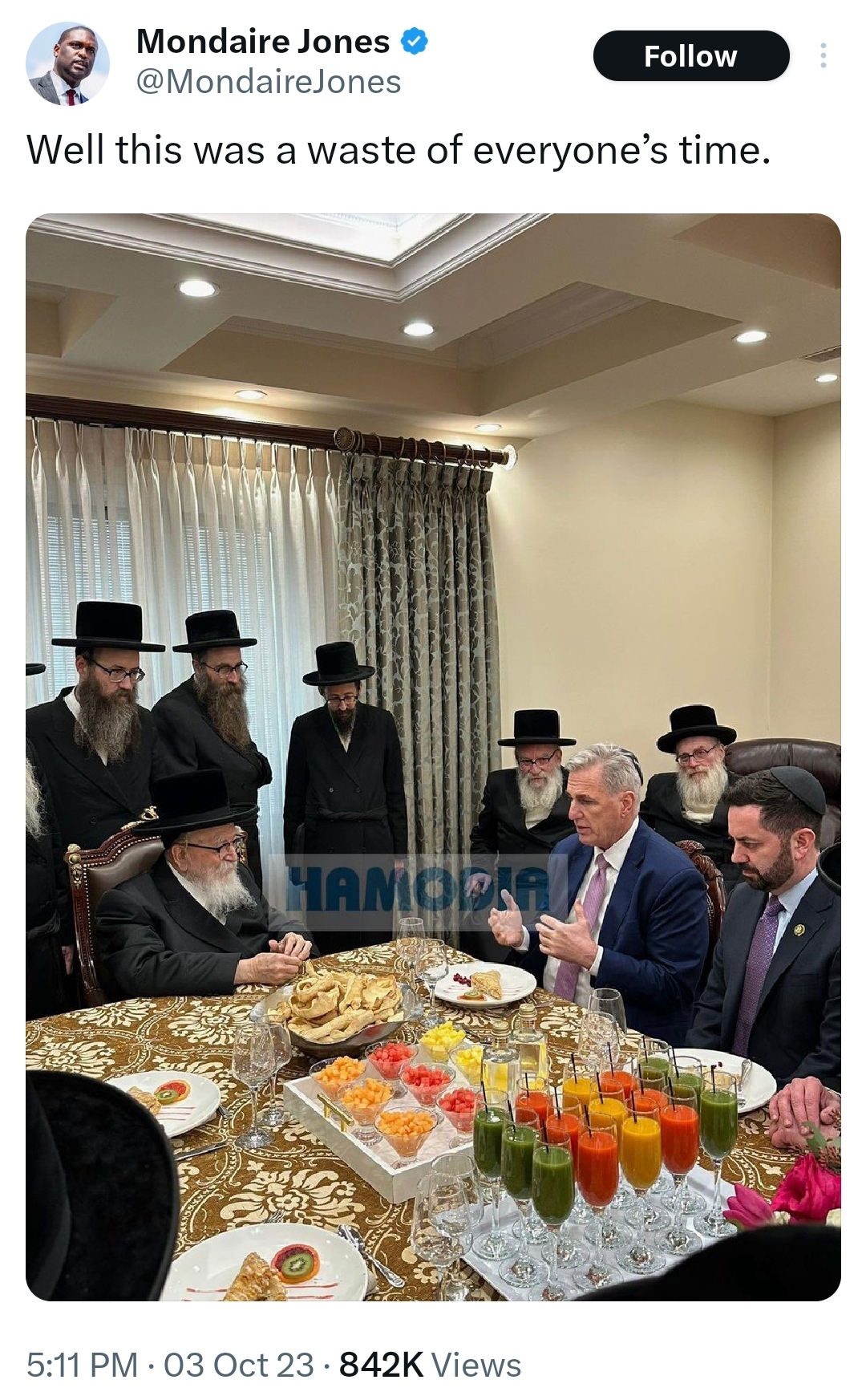 He obviously means that the Skvere Rebbe wasted his time meeting with McCarthy because he is no longer Speaker and won’t follow through with whatever he promised. So all those pastry’s and goody’s where made for nothing, what a waste of time and energy.