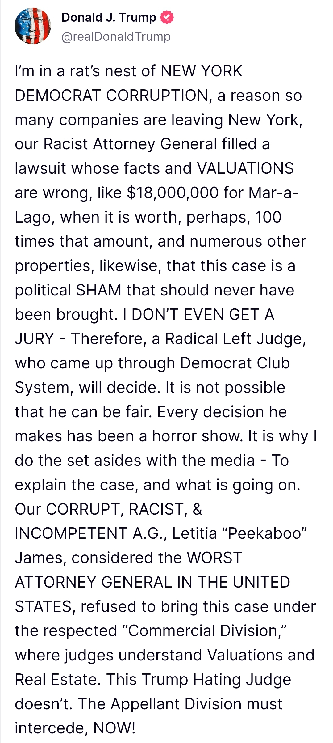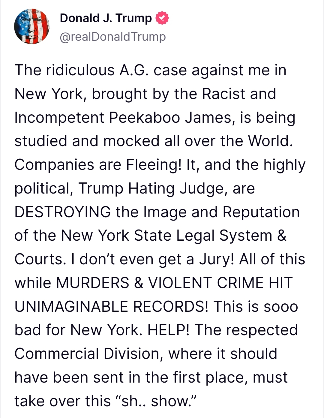 Trump continued his criticism of AG James, labeling her as “Racist and Incompetent” and deploring the state of New York’s legal system. He reiterated his grievance over not having a jury trial, and in a noticeable escalation of his rhetoric, called for help regarding the perceived injustices.