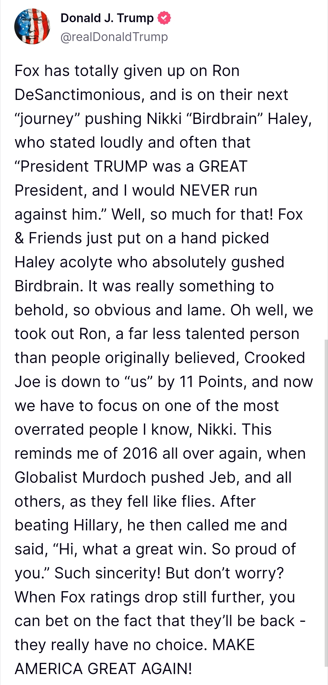 The former president then apparently went to watch Fox News, blasting off a post about the network giving too much coverage to Nikki Haley.