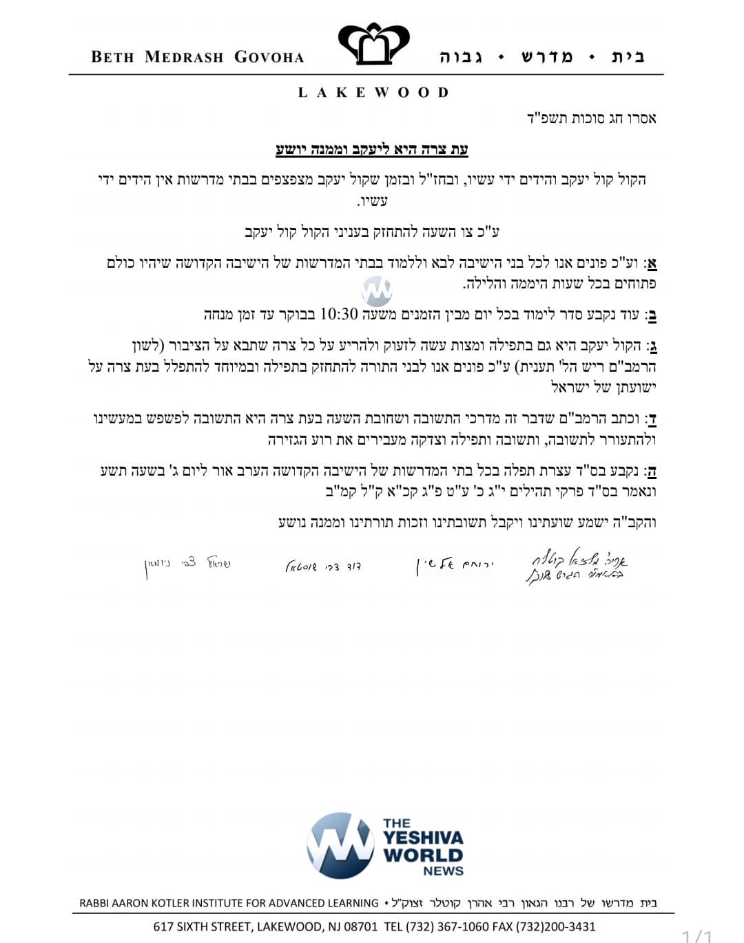 Tonight, Monday evening, an atzeres tefillah will be held in all the botei medrash of the yeshiva at 9 p.m. They roshei yeshiva have called upon all shuls to convene atzeres tefillah gatherings as well, each kehillah in their own botei knesses, reciting the designated kappitlach of Tehillim of 13, 20, 79, 83, 121, 130, and 142.