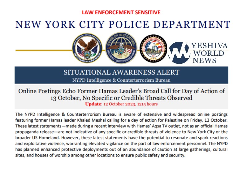 The NYPD urges all Yeshivas, Shuls and community members to go about their regular daily business on Friday, October 13, 2023. This includes keeping Shuls and Yeshivas open.
