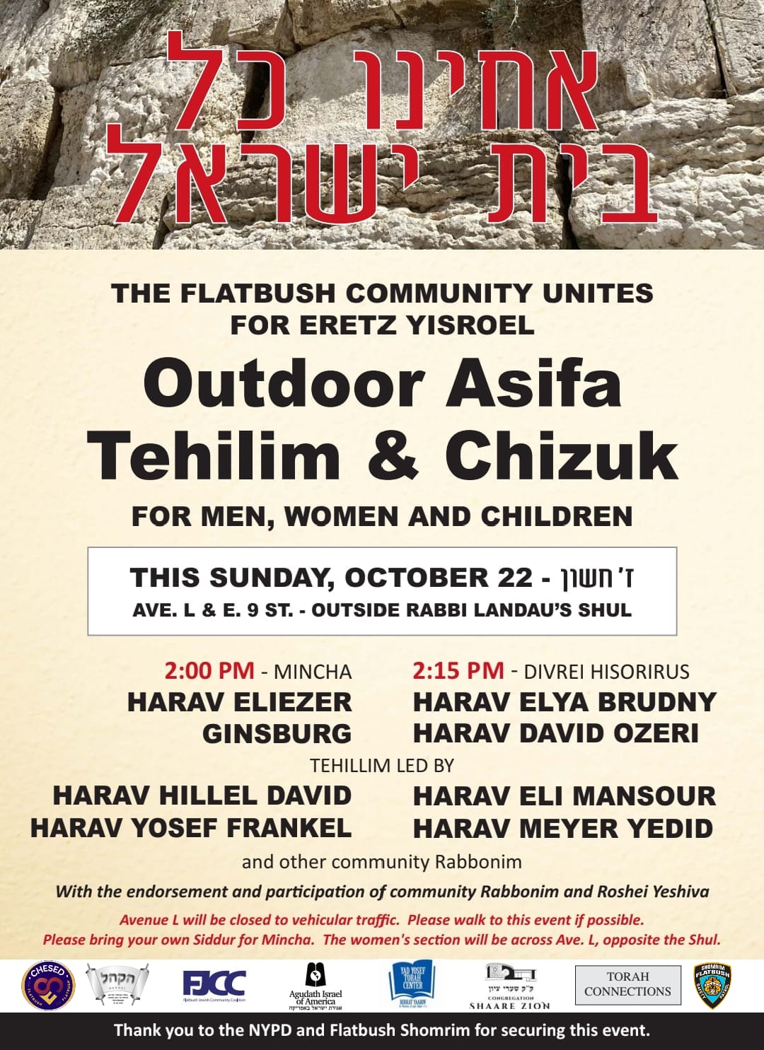 Flatbush Jewry is uniting in Tefillah to support our brothers and sisters in Eretz Yisroel this Sunday, October 22 at 2:00PM outside the centrally located Rabbi Landau’s shul, on Avenue L and East 9 Street.