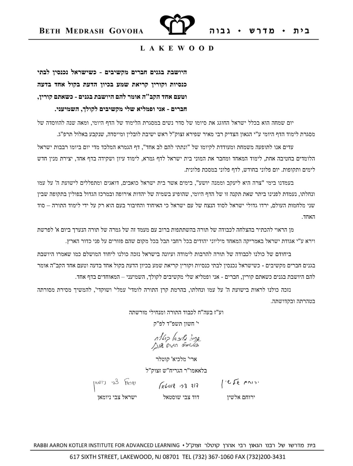 The Roshei Yeshiva of Lakewood wrote a letter encouraging universal participation in the upcoming Daf Yomi Siyum on Seder Nashim.