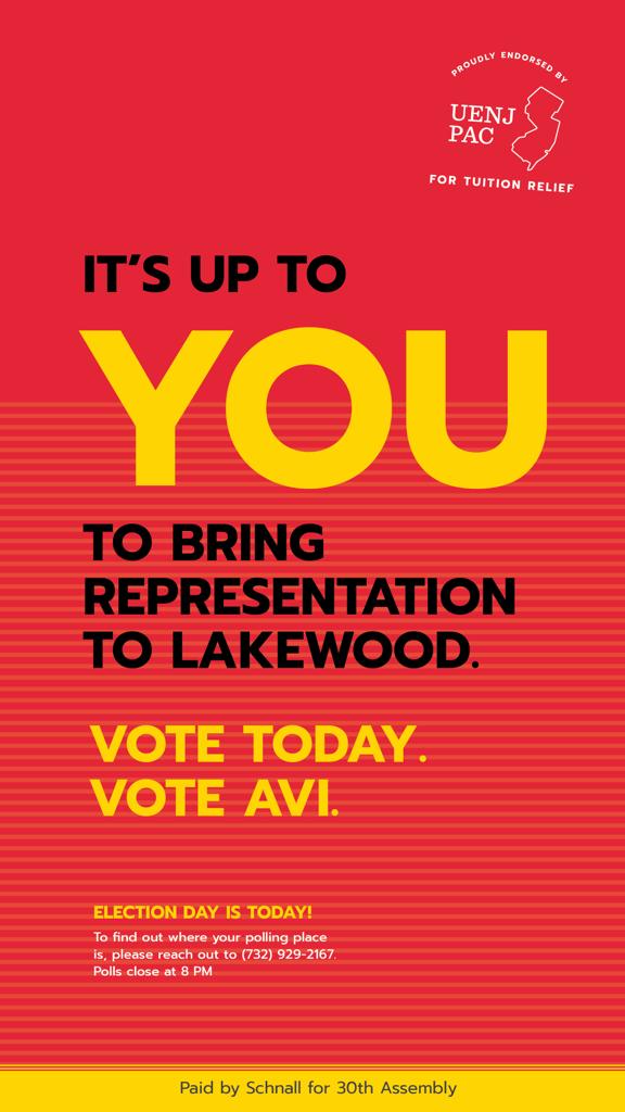 Lakewood residents are heading to the polls today, heeding the unanimous call of the gedolim of Lakewood and beyond to elect Avi Schnall as their new representative in the New Jersey Assembly.