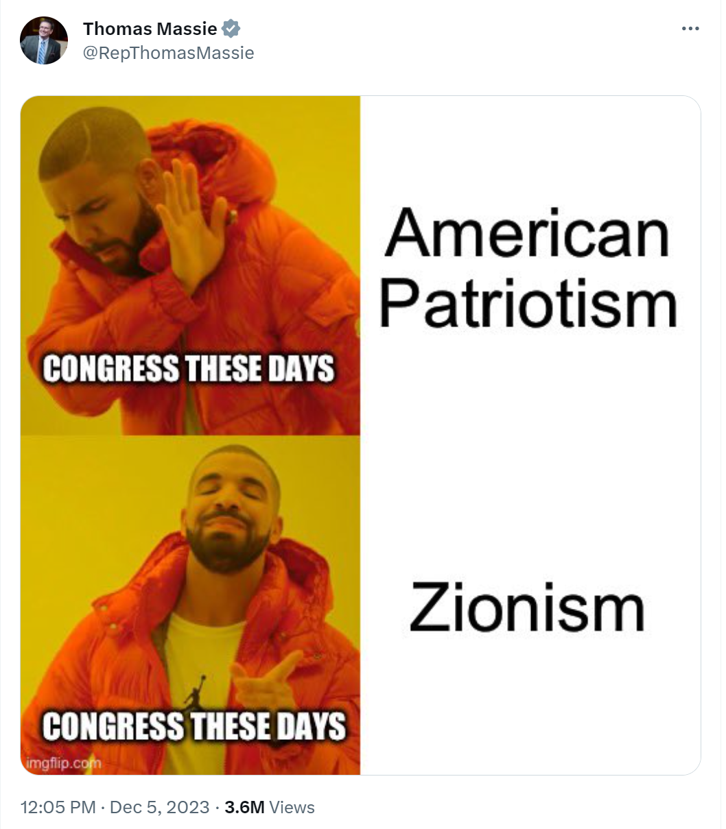 Rep. Thomas Massie (R – KY) posted an antisemitic meme on X (formerly Twitter) on Tuesday that pits “American Patriotism” against “Zionism.” The post has garnered significant and well-deserved negative attention and criticism from both sides of the political aisle.
