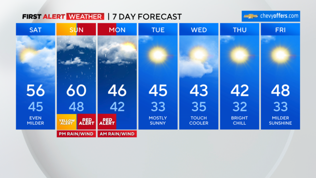 Winds will be breezy during the day Sunday and ramp up in the evening with peak gusts of up to 60 mph possible through early Monday morning. Downed trees and power lines could produce widespread power outages, particularly along the coast.
