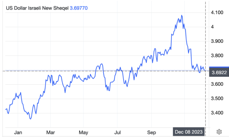 Israeli Shekel’s Movement: Despite limited foreign currency sales, the shekel strengthened by 9% in November, trading around NIS 3.70/$ currently.