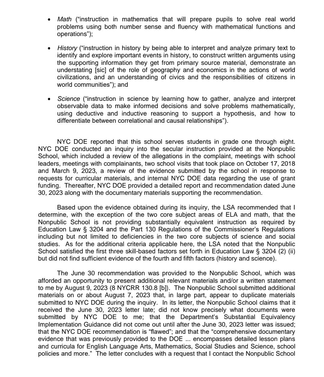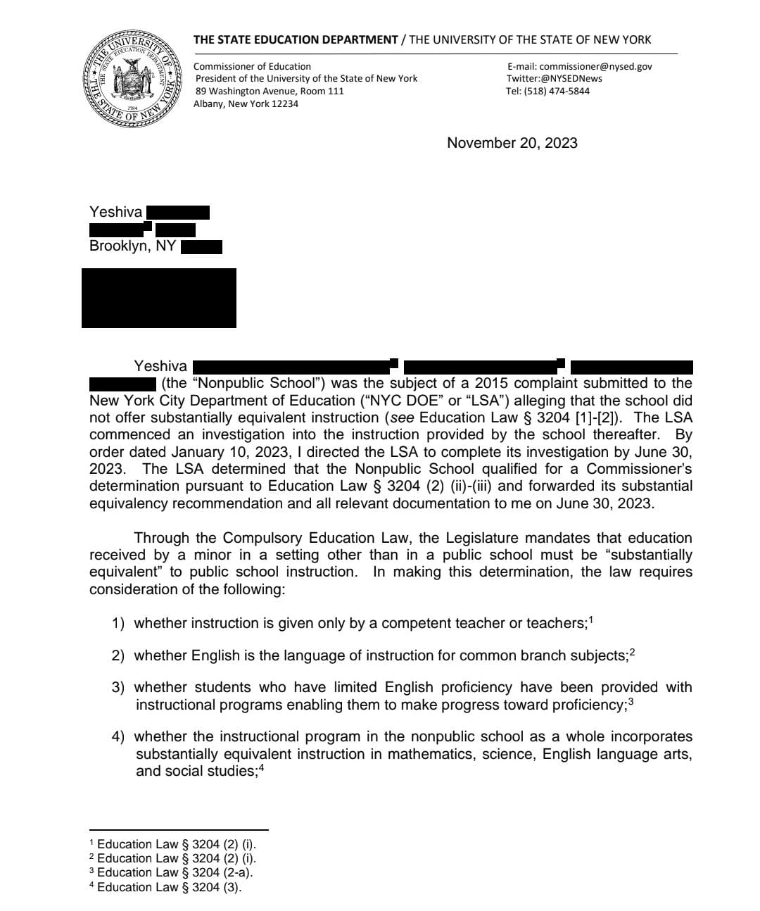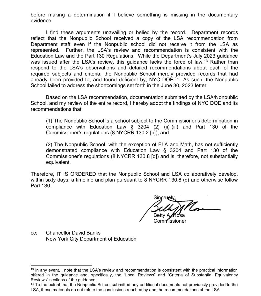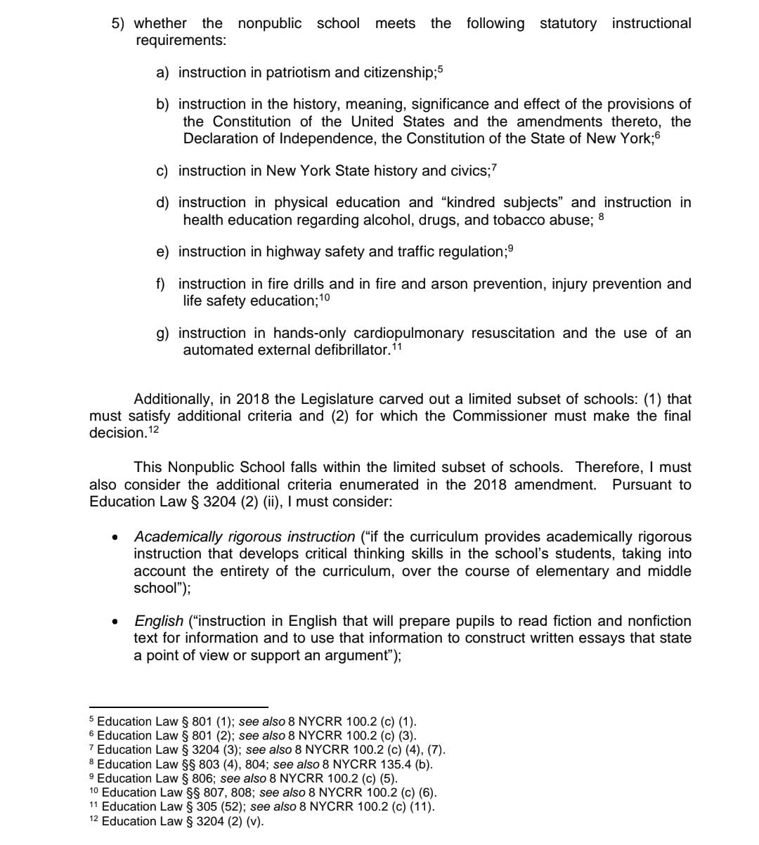 State Education Department Rules That Brooklyn Yeshiva Is Not Substantially Equivalent Even Though It Provides Instruction In English And Math That Is Substantially Equivalent
