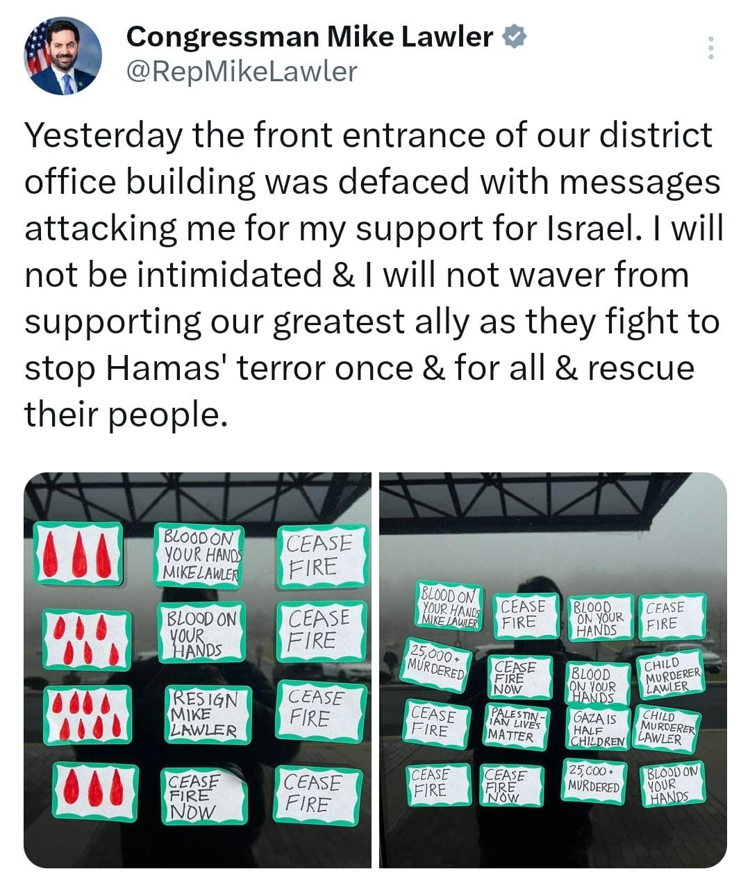 “I will not be intimidated and I will not waver from supporting our greatest ally as they fight to stop Hamas’ terror once and for all and rescue their people,” Lawler wrote.