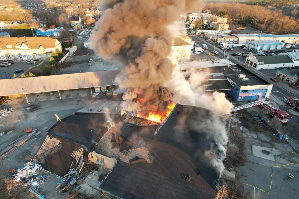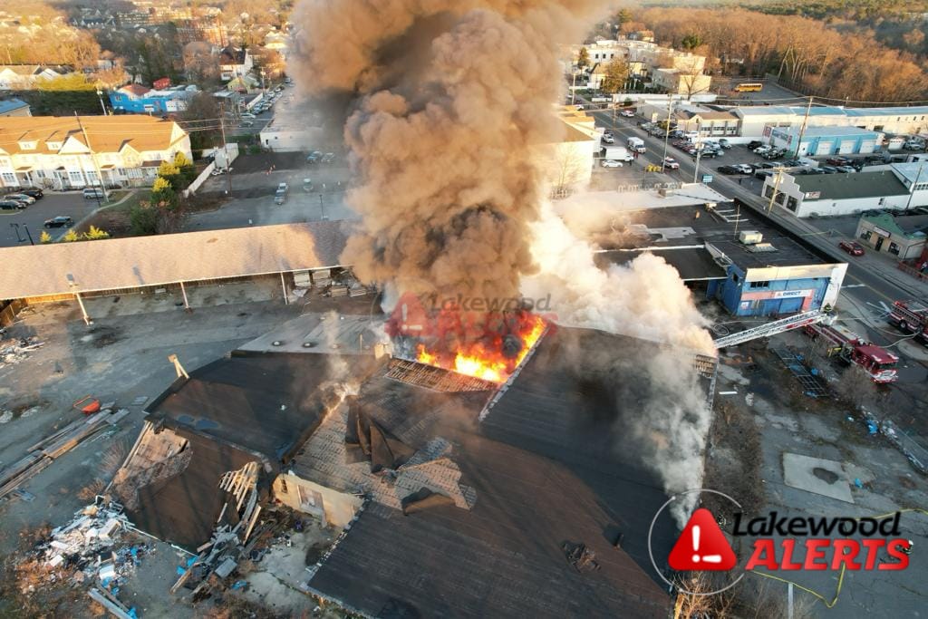 Firefighters in Lakewood were battling a three-alarm blaze at a lumber yard on Ocean Avenue on Monday afternoon.