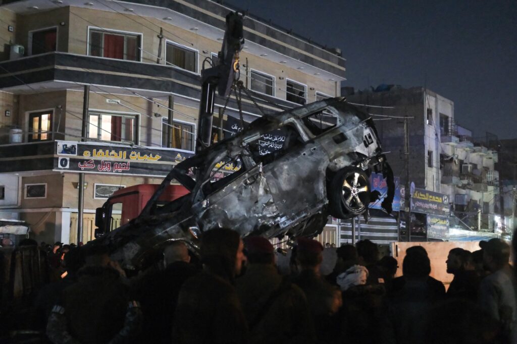 The strike came on a main thoroughfare in the Mashtal neighborhood in eastern Baghdad. A crowd gathered as emergency response teams picked through the wreckage. Security forces closed off the heavily guarded Green Zone, where a number of diplomatic compounds are located, amid calls for protesters to storm the U.S. embassy.