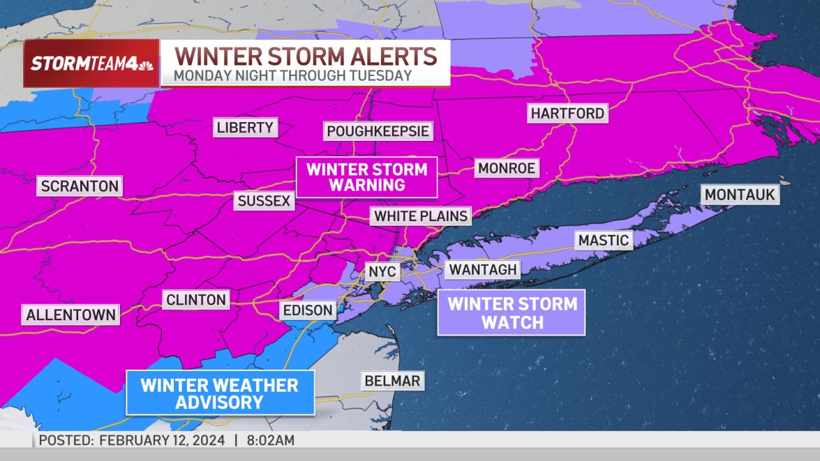 Snow totals could reach 6 to 12 inches north of the city, into northwestern New Jersey and the Hudson Valley. The National Weather Service issued a winter storm warning for a swath of the region. New York City is under a winter weather watch, along with Long Island.
