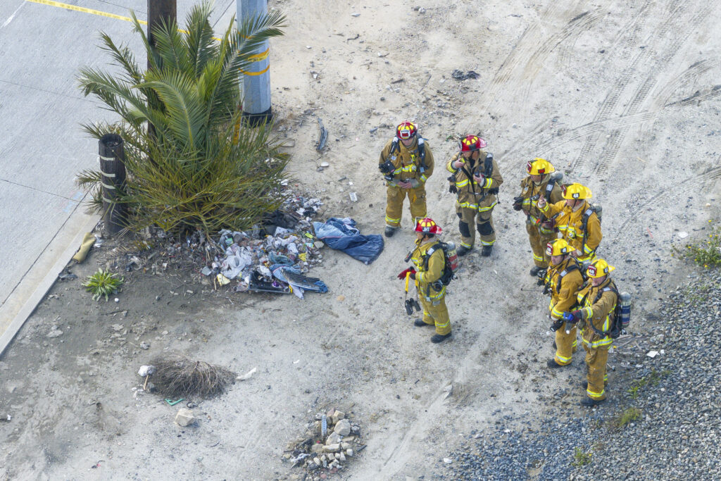 TV news helicopter video showed charred and mangled parts of the truck with a small flame still burning along with discarded firefighting gear where the injured crew members were initially treated.
