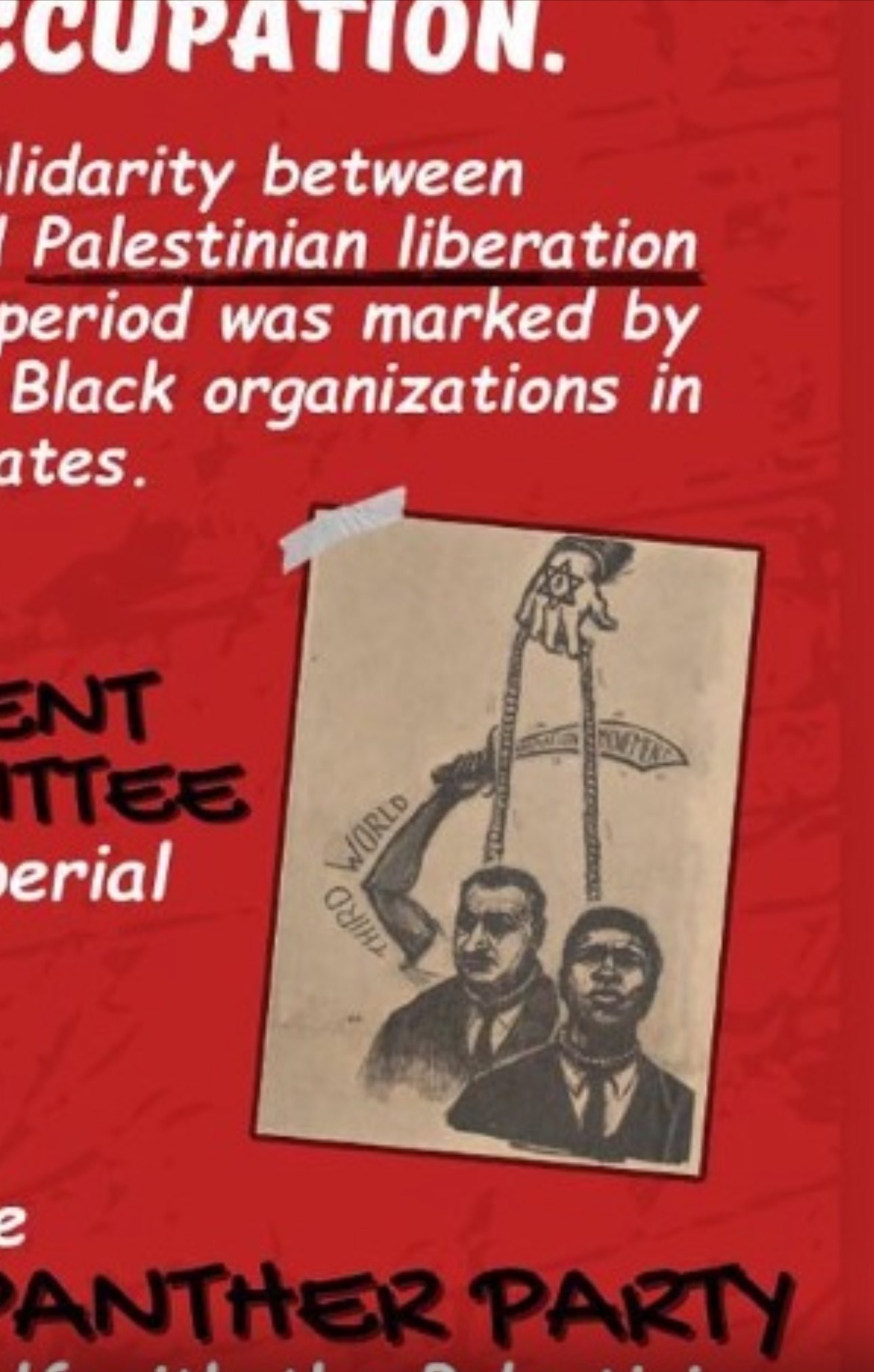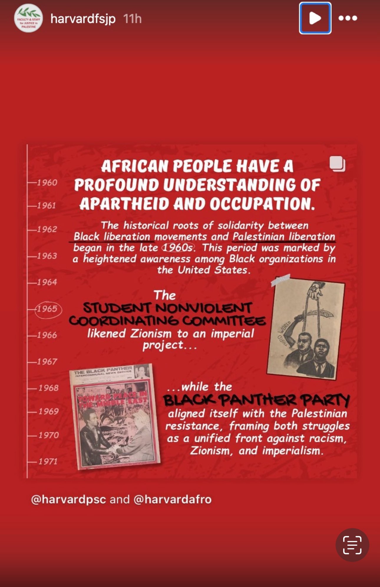 The post asserts a historical connection between Black liberation movements in the United States and Palestinian liberation, starting in the late 1960s. It suggests that organizations like the Student Nonviolent Coordinating Committee viewed Zionism as imperialist, while the Black Panther Party saw their struggle as part of a united front against racism, Zionism, and imperialism.