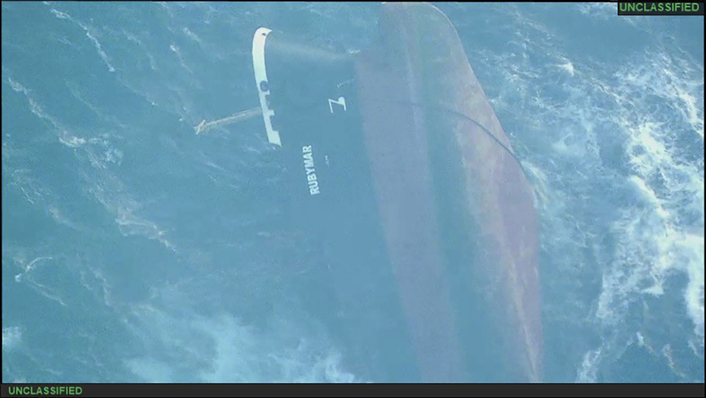 The U.S. military’s Central Command said early Sunday the Rubymar sank at 2:15 a.m. local time Saturday. It released an image of the vessel on its side as it was sinking.
